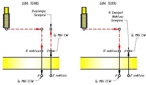 G84 çevrimi normal (Sağ diş) kılavuz açma işlemleri için kullanılır. Kılavuz saat ibresinin yönünde dönerek belirlenen ilerleme değerinde diş açar. Hedef derinliğe ulaştığında P değerinde tezgâh mili durur, bekler ve ters yönde dönerek aynı ilerleme hızında geri çıkar.